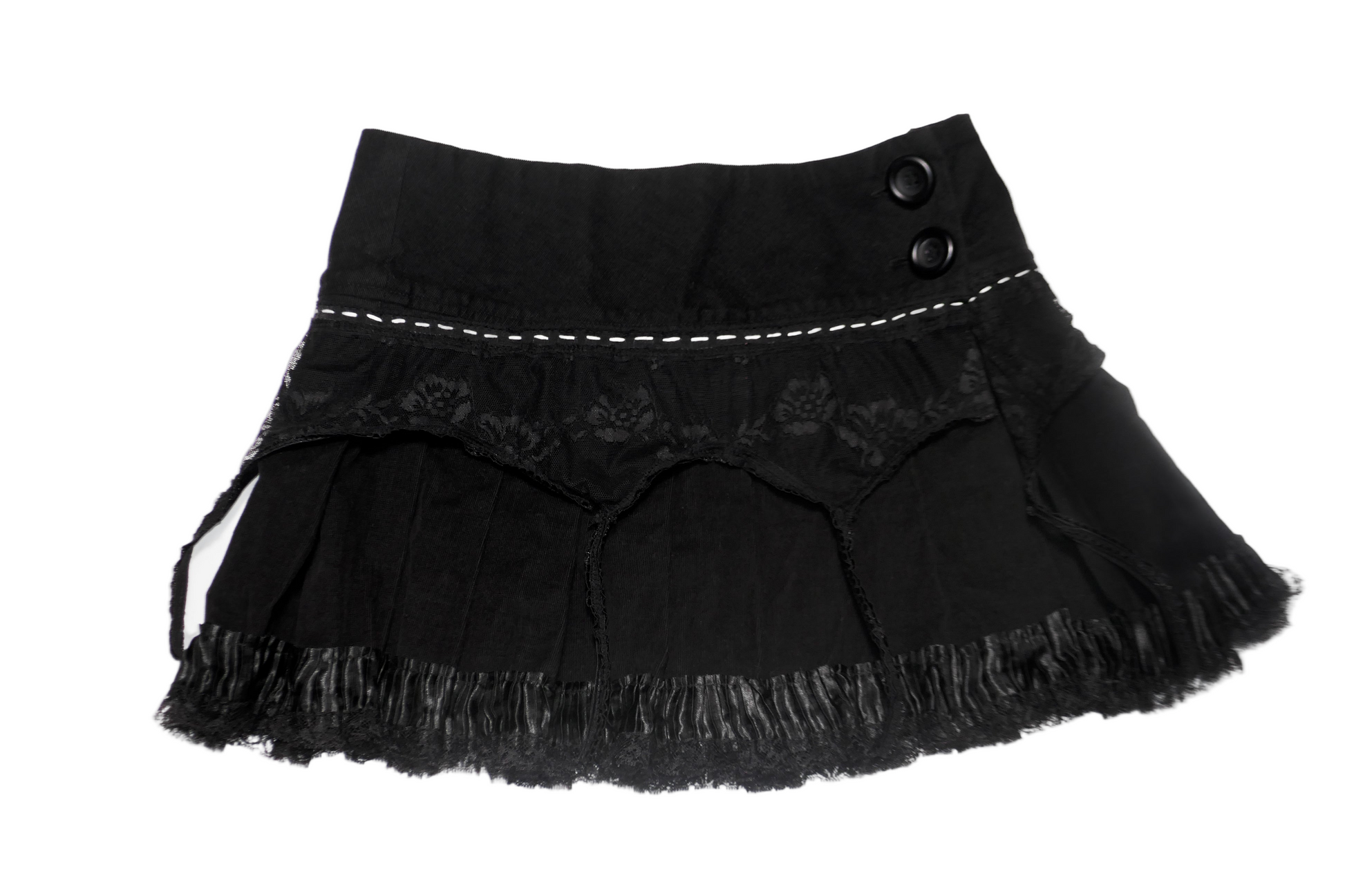 1/1 upcycled skirt built from reclaimed materials, finished with hand sewn lace and a custom guarded belt for a structured, one of a kind look.